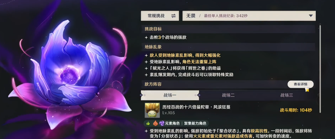- 挑战机制:旅行者需选择对应难度参与挑战,进入后需连续完成三场限时战斗,在限定时间内击败所有敌人,三场战斗均完成即为挑战成功;